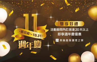 感謝媽咪們一路上的支持 與鼓勵 週年慶【特別專案】活動開跑囉 【好禮一】 活動時間:即日起至10/31止 活動方式:於活動期間內 當日訂房達20天以上,享【...